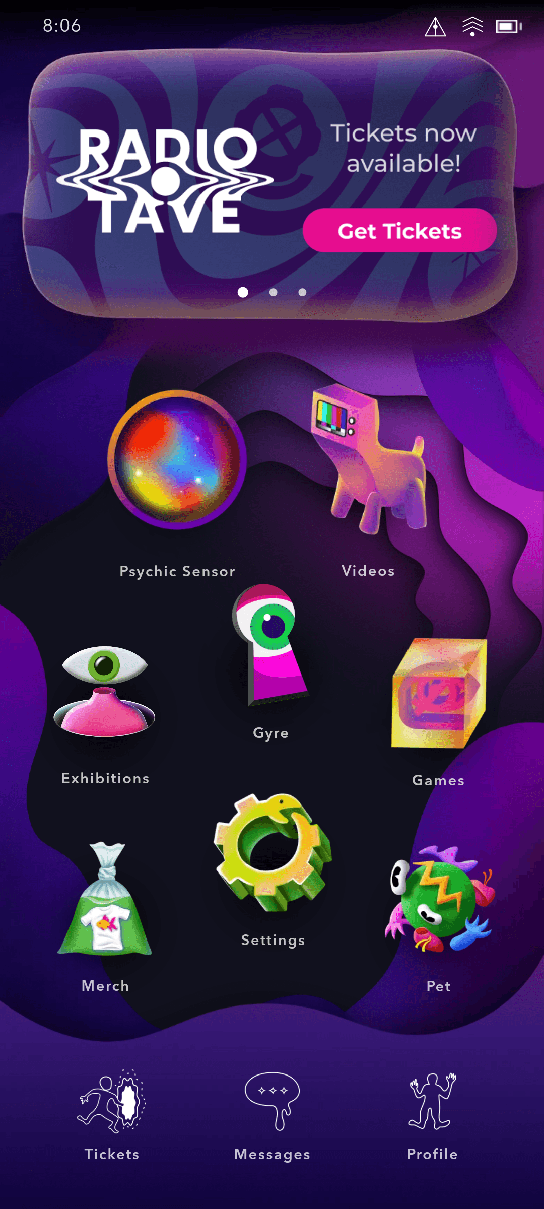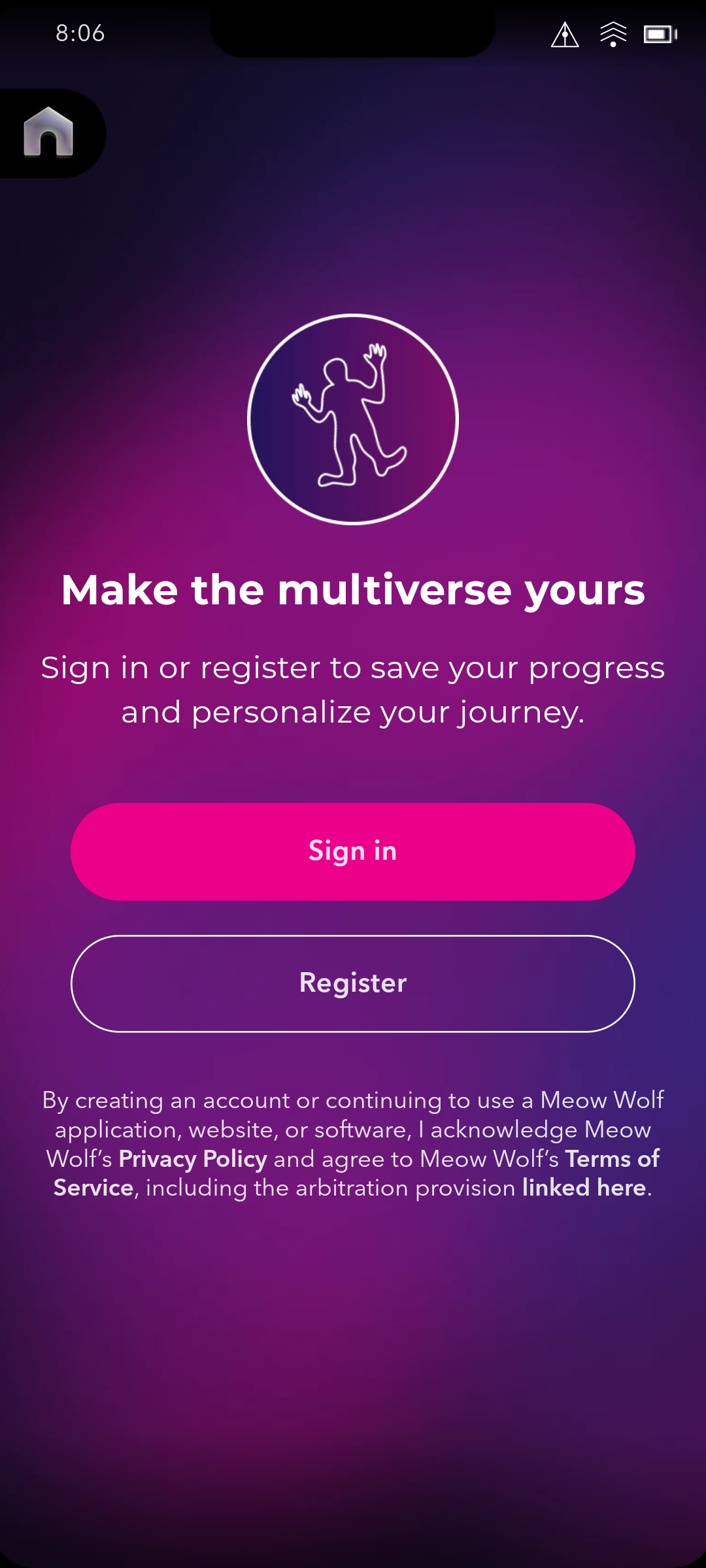Meow Wolf aimed to create an app that would extend the Meow Wolf universe beyond their physical exhibitions and serve as a hub for ticket sales. Their original vision for the app was focused on keeping users engaged after they leave an exhibition.